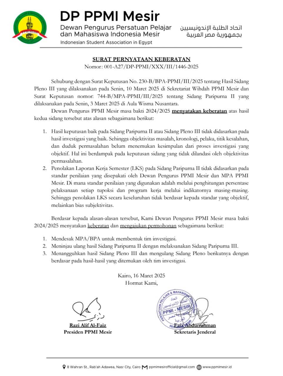 Namun, bukannya segera melaksanakan kewajiban tersebut, sehari setelah Badan Perwakilan Anggota (BPA) PPMI Mesir mengeluarkan Memorandum I, DP PPMI Mesir justru menerbitkan Surat Pernyataan Keberatan atas hasil Sidang Paripurna II (03/03/2025) dan Sidang Pleno III (10/03/25). Surat itu diunggah oleh Ari Pratama Syuhada, Wakil Presiden PPMI Mesir di status WhatsApp miliknya pada Kamis (16/03/2025).