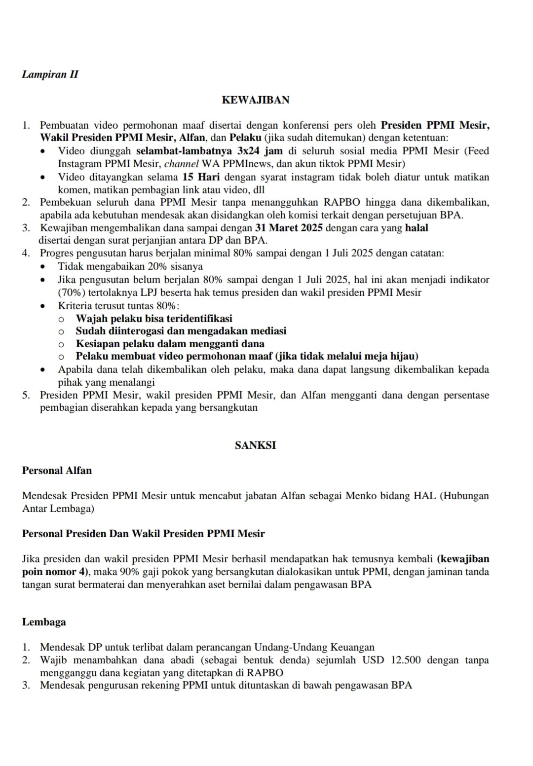 Bagai menjilat ludah sendiri, pernyataan Wakil Presiden PPMI Mesir, Ari Pratama Syuhada yang mengklaim akan menerima semua keputusan pada Sidang Pleno III, Kamis (06/03/2025) rupanya hanya sebatas kata-kata. Kewajiban untuk membuat video permohonan maaf yang telah ditetapkan tak kunjung tuntas ditunaikan hingga batas waktu yang telah ditentukan. Adapun bunyi ketetapan sidang tersebut, sebagai berikut: