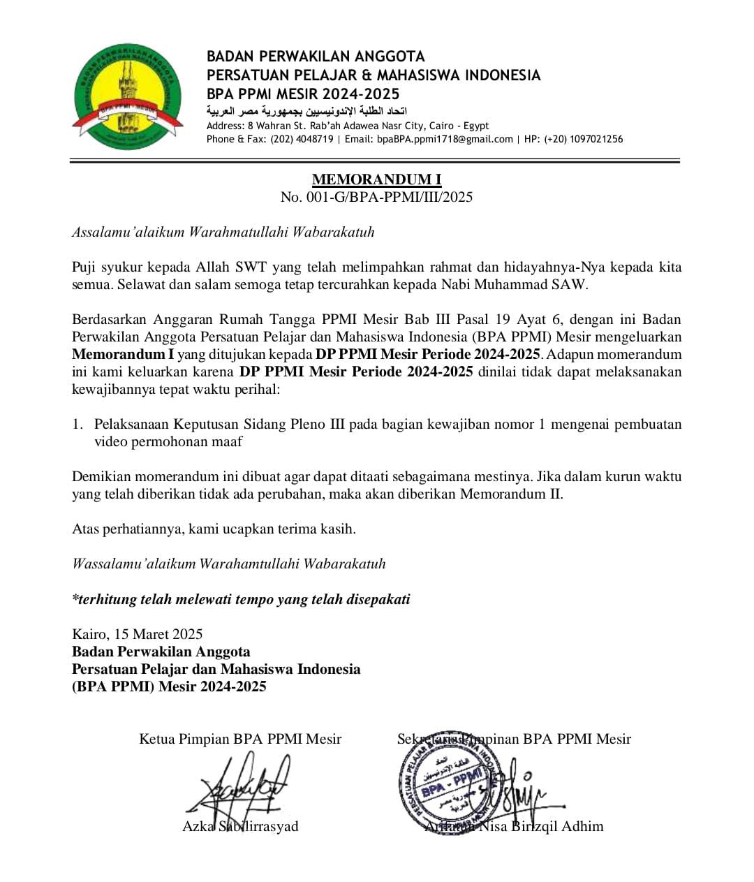 Menanggapi hal tersebut, Badan Perwakilan Anggota (BPA) PPMI Mesir mengeluarkan Memorandum I pada tanggal 15 Maret 2025 sebagai peringatan kepada Presiden, Wakil Presiden, dan Alfan yang tidak melaksanakan kewajiban poin (1) dari ketetapan Sidang Pleno III di atas. Dalam Memorandum I itu dipaparkan, bahwa jika dalam kurun waktu yang telah diberikan tidak ada perubahan, maka akan diberikan Memorandum II.