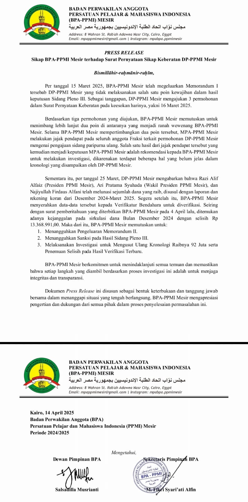 Dalam rilis pers yang dikirim pada pukul 00:09 EET di grup WhatsApp “PUSAT INFORMASI IJMA” tersebut, BPA menyatakan bahwa alasan terbitnya kedua poin di atas adalah hasil pertimbangan dari surat keberatan yang diajukan oleh DP PPMI Mesir. Di mana salah satu poinnya menyatakan keberatan dengan hasil Sidang Pleno III dikarenakan hasil sidang tersebut dinilai tidak berdasarkan investigasi yang baik dan menuntut untuk dibentuknya tim investigasi dari BPA itu sendiri.